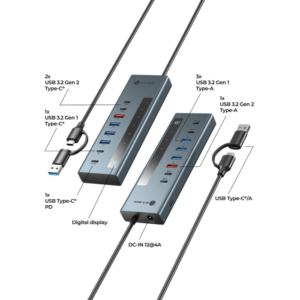 IB-HUB1743-CPD je zmogljiv večportni USB-C razširitveni hub, zasnovan za uporabnike, ki potrebujejo hitro povezljivost, stabilno napajanje in razširjeno funkcionalnost v kompaktni aluminijasti izvedbi. Hub se na računalnik povezuje prek vmesnika USB-C 3.2 Gen 2 in omogoča prenose podatkov do 10 Gbit/s, pri čemer podpira UASP ter Plug & Play za takojšnje delovanje brez dodatnih gonilnikov. Naprava vključuje kombinacijo USB-A in USB-C priklopov: en USB-A 3.2 Gen 2, tri USB-A 3.2 Gen 1, en USB-C 3.2 Gen 1 in dva USB-C 3.2 Gen 2, kar omogoča hkratno povezovanje več zunanjih naprav, kot so pomnilniki, periferija ali dodatna oprema. Vgrajeni USB-C Power Delivery port omogoča napajanje naprav z močjo do 20 W, medtem ko USB-C upstream PD zagotavlja do 100 W moči za napajanje prenosnika. LED zaslon omogoča nadzor nad porabo energije v realnem času.
