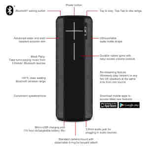 Ultimate Ears Boom 2. Premer gonilnika globokotonca: 1,75″ Frekvenčno območje: 90 – 20000 Hz, občutljivost: 90 dB. Tehnologija prenosa: Žični & Brezžično, Bluetooth profili: A2DP,HFP, Domet Bluetooth: 33 m Barva izdelka: Črna, Oblika izdelka: Tube, Zaščitne lastnosti: Vodoodporen. Priporočena uporaba: Mobilni telefon / pametni telefon, Podprti mobilni operacijski sistemi: Android, iOS