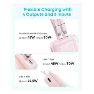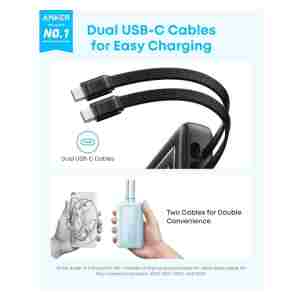 Vgrajena dvojna kabla: Polnite brez napora z dvema vgrajenima kabloma, vključno z dvojnim USB-C kablom. Kabla sta preizkušena za več kot 10.000 pregibov za dolgotrajno uporabo.