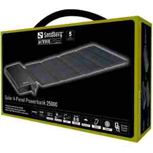 Podatki o pakiranju: 1x Sandberg Solar 4-Panel Powerbank 25000, 1x USB-C v USB-C kabel 30 cm, 1x USB-A v USB-C kabel 30 cm, 1x karabin, 1x navodila za uporabo