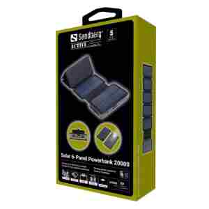 Podatki o pakiranju: 1x Sandberg Solar 6-Panel Powerbank 20000 mAh, 1x karabin, 1x USB-A na USB-C kabel (30 cm), 1x navodila za uporabo