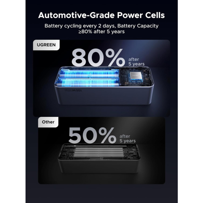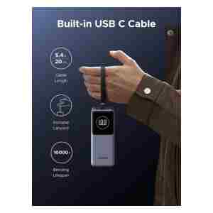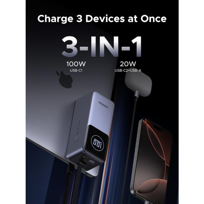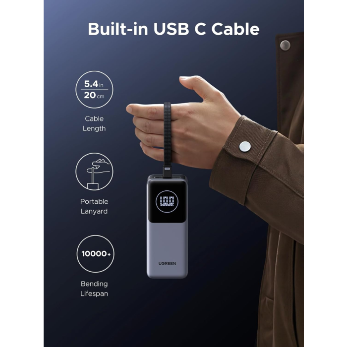 UGREEN 55365B je zmogljiv power bank s kapaciteto 20.000 mAh in skupno izhodno močjo do 130 W. Opremljen je z vgrajenim USB-C kablom ter dodatnima priključkoma USB-C in USB-A, kar omogoča hitro polnjenje prenosnikov, tablic in pametnih telefonov, kjerkoli ste.