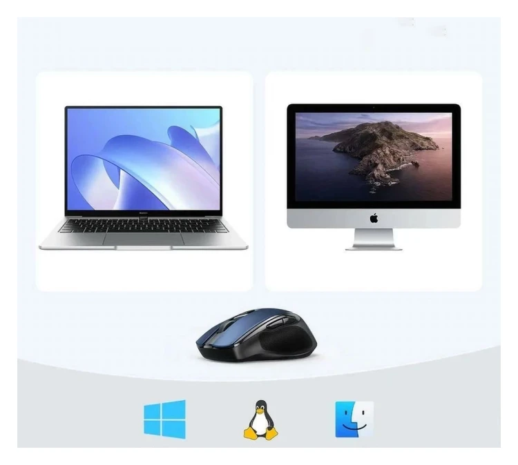 Združljiv bo z vašo opremo. Model MU006 je naprava Plug&Play. Zato ni treba namestiti nobenega gonilnika. Preprosto povežite USB oddajnik z vašo napravo Windows 10/8/7, Mac OS, Chrome OS, Linux, Android in takoj uživajte v vseh funkcijah miške. Poleg tega miška komunicira prek Wi-Fi 2,4 GHz in Bluetooth 5.0.