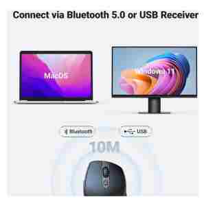 Ta brezžična miška podpira možnosti povezljivosti sprejemnika Bluetooth 5.0 in 2,4 GHz; Združljiv je s številnimi operacijskimi sistemi, vključno z Windows (7/8.1/10/11), macOS (10.15 in novejši), iOS (13.4 in novejši), Android (5.0 in novejši), ChromeOS in Linux