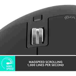MX Master 3S je opremljena s Quiet Click tehnologijo, ki zaduši 90% zvoka ob kliku, vseeno pa pusti enak občutek na gumbu. Opremljena je tudi z MagSpeed elektromagnetnim koleščkom, ki omogoča drsenje po tisočih straneh brez napora.