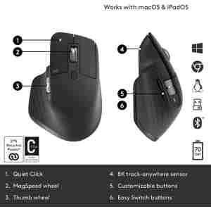Ergonomsko oblikovana brezžična miška z senzorjem z 8000 DPI. Miška je opremljena s tihim klikom in magnetnim koleščkom za hitro drsenje po tisočih vrsticah. Senzor omogoča tudi uporabo na steklenih površinah in mizah. Nudi povezavo preko USB Logi Bolt sprejemnika ali Bluetooh povezave.
