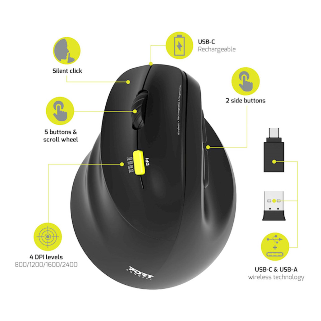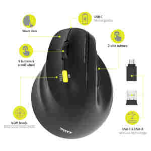 Ergonomska miška z nagnjeno obliko, izboljša udobje uporabe in zmanjša napetost zapestja in podlakti. Primerna le za desničarje. Opremljena je z brezžično tehnologijo 2,4 Ghz, Bluetooth, z USB-A, USB-C sprejemnikom in polnilno baterijo ter USB polnilnim kablom. Njegov sistem »plug & play« omogoča hitro in enostavno uporabo. Izkoristite tudi nastavljiv optični senzor za optimalno natančnost: 800/1200/1600 DPI. Združljiva je z operacijskim sistemom Windows in Mac OS. Prevzemite nadzor s 5 tipkami in drsnim kolesom: desni / levi klik, sredinski in naprej / nazaj.