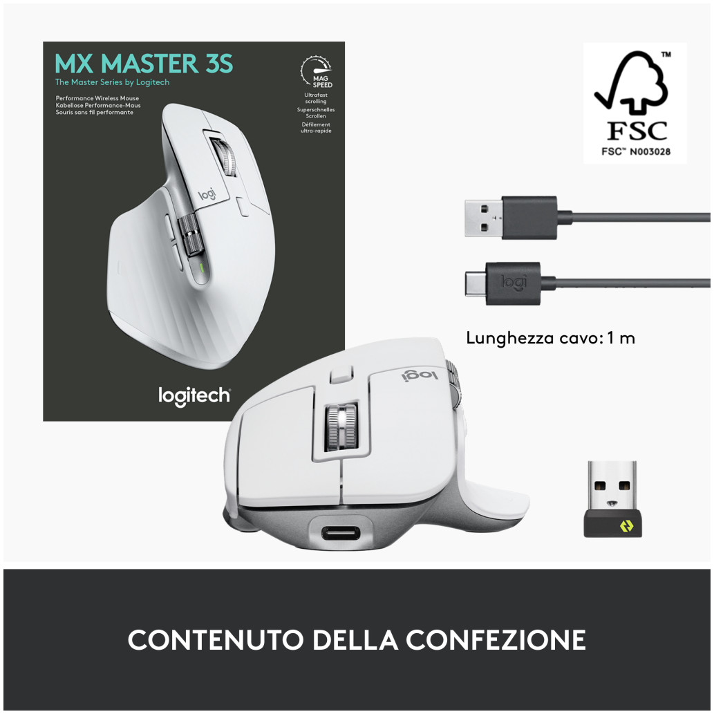 Logitech MX Master 3S. Faktor oblike: desno. Tehnologija zaznavanja gibanja: Optični, Vmesnik naprave: RF Wireless + Bluetooth, Ločljivost gibanja: 8000 DPI, Tip gumba: Pritisnjeni gumbi, Število gumbov: 7, Vrsta drsenja: Kolesce. Vir napajanja: baterije. Barva izdelka: srebrna, bela.