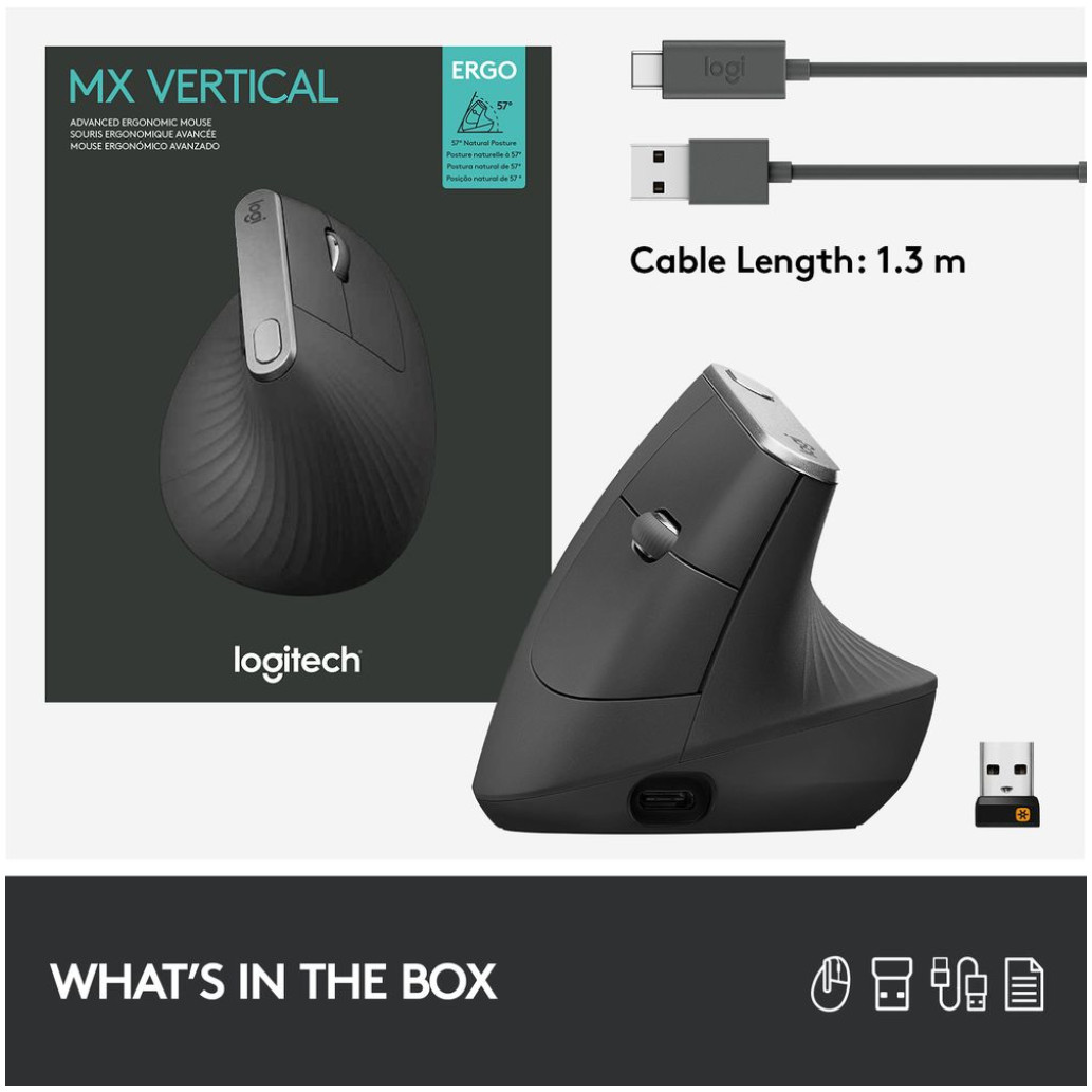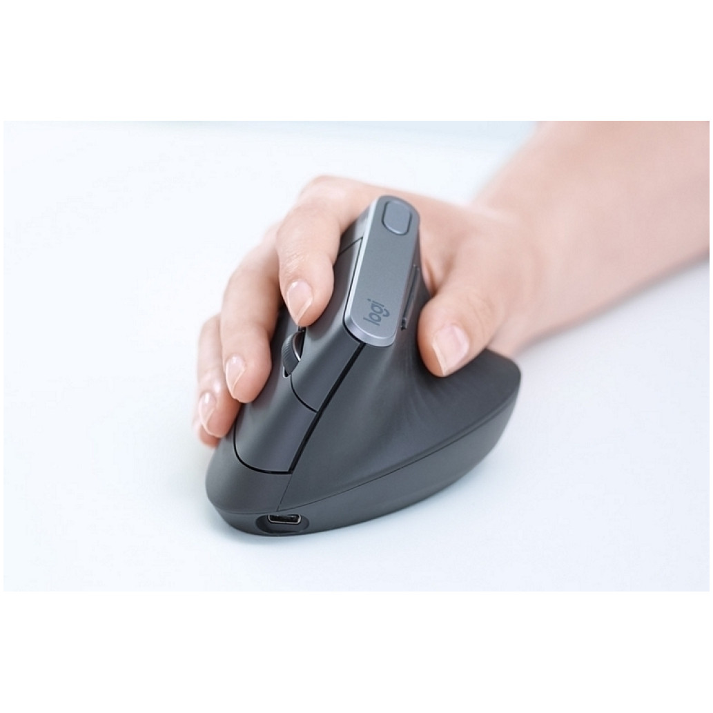Logitech MX Vertical. Faktor oblike: desno. Tehnologija zaznavanja gibanja: Optična, Vmesnik naprave: RF brezžična + Bluetooth, Ločljivost gibanja: 4000 DPI, Vrsta gumbov: Pritisnjeni gumbi, Vrsta pomika: Kolo Vir napajanja: Baterije. Barva izdelka: Črna, Srebrna
