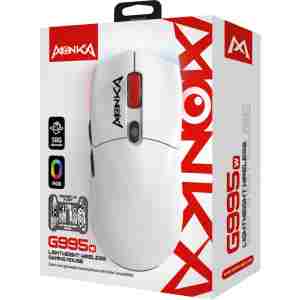 Monka Guru G995W je brezžična igralna miška, zasnovana za vrhunsko igralno izkušnjo. Ponuja tri načine povezave: 2,4 GHz brezžično, USB-C in Bluetooth, kar omogoča prilagodljivost glede na vaše potrebe. Miška je opremljena s senzorjem PAW3395, ki omogoča nastavljivo ločljivost DPI na 1200, 2400, 3200, 4800, 8000 ali 26000, kar zagotavlja natančnost in hitrost pri igranju. Z življenjsko dobo stikal do 3 milijone klikov in šestimi programsko nastavljivimi gumbi je primerna za intenzivno uporabo. RGB osvetlitev v sedmih barvah dodaja estetsko vrednost, medtem ko njena lahka zasnova s težo le 58 g omogoča udobno uporabo. Dimenzije miške so 123,4 mm x 62 mm x 39,5 mm, priložen pa je tudi 1,5-metrski kabel za polnjenje.