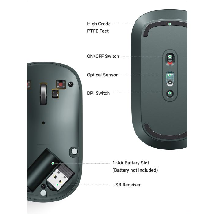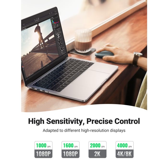 Brezžična miška UGREEN je tanka in tiha miška, ki deluje na 2.4GHz s 4000 DPI in zaradi naprednega čipa omogoča delovanje do 18-mesecev z eno baterijo (ni priložena).