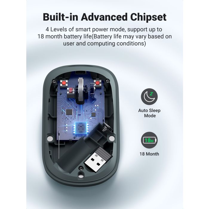 Napreden procesni čip z inteligentno tehnologijo za varčevanje z energijo brezžični miški omogoča delovanje do 18 mesecev.