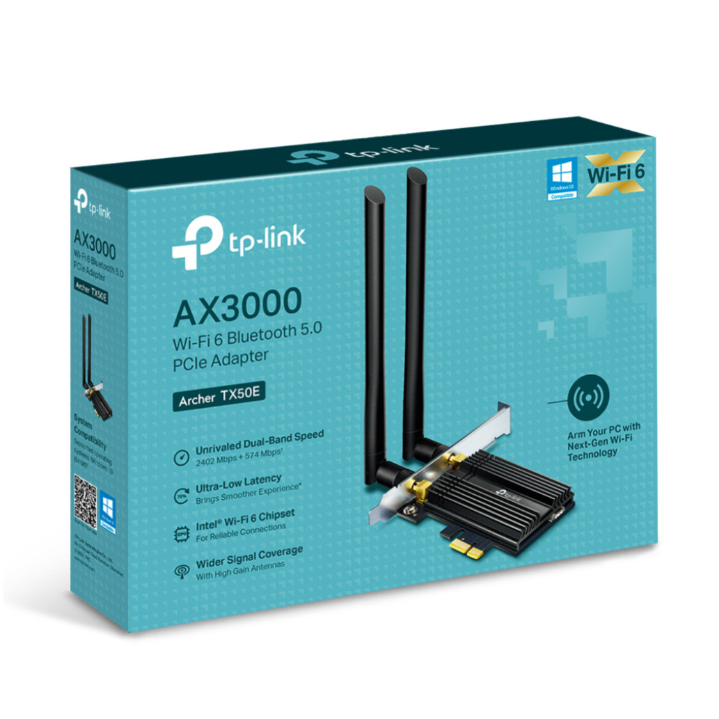 TP-LINK Archer TX50E. Tehnologija povezovanja: Brezžična, Vmesnik gostitelja: PCI Express, Vmesnik: WLAN / Bluetooth. Največja hitrost prenosa podatkov: 2402 Mbit/s, vrhunski standard WLAN: Wi-Fi 6 (802.11ax), pas WLAN: dvopasovni (2,4 GHz/5 GHz). Barva izdelka: črna, kovinska