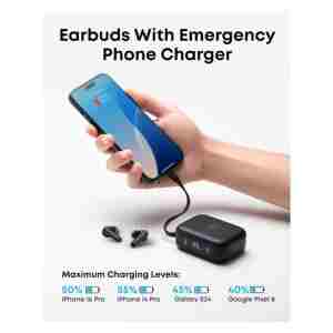 • Prenosno polnjenje telefona: Polnilna škatlica napolni iPhone 16 Pro do 50 % ali Samsung Galaxy S24 do 45 % z močjo 10 W in kapaciteto baterije 3.000 mAh.