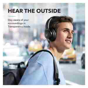 preklopite v način prosojnosti na slušalkah za odpravljanje hrupa, ko morate biti pozorni na svojo okolico, kot so obvestila o prometu, prečkanje ceste ali preprosto ostati povezani s svetom okoli sebe.
