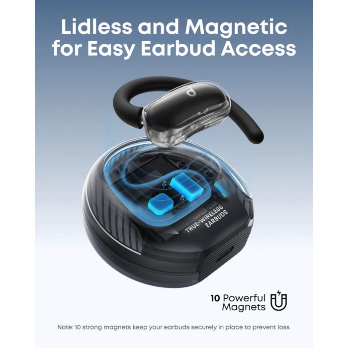 - Elegantna, prihodnosti pripravljena zasnova: Prosojna polnilna škatlica vključuje močne magnete, ki preprečujejo nenamerno izgubo, ter svetlobno vrstico, ki vas sproti obvešča. Uživajte v glasbi v slogu – kjerkoli ste – z oblikovno dovršenim, kompaktnim in prenosnim dizajnom.