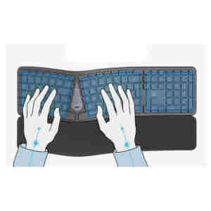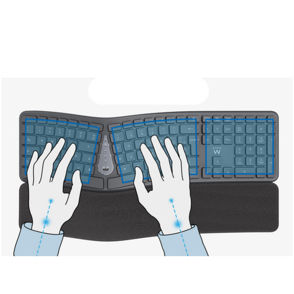 Tipkovnica s svojo ukrivljeno zasnovo omogoča naravno držo med tipkanjem ter zmanjšuje napetost v zapestjih in v podlakti.