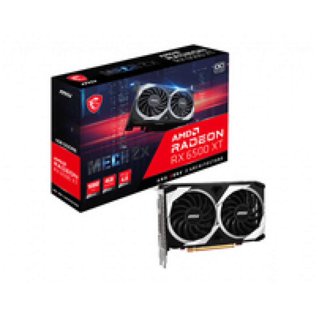 MSI RADEON RX 6500 XT MECH 2X 4G OC. Družina grafičnega procesorja: AMD, GPU: Radeon RX 6500 XT. Pomnilnik diskretnega grafičnega adapterja: 4 GB, Vrsta pomnilnika grafične kartice: GDDR6, Širina pomnilniškega vmesnika: 64-bit, Frekvenca pomnilnika: 1800 MHz. Največja ločljivost: 7680 x 4320 slikovnih pik. Različica DirectX: 12.0, različica OpenGL: 4.6. Vmesnik: PCI Express 4.0 Hlajenje: Aktivno, Število ventilatorjev: 2 ventilatorja