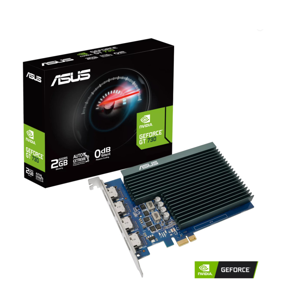 ASUS GeForce GT 730 je pasivno hlajena grafična kartica z eno režo za produktivno delo z več monitorji v tihem okolju.