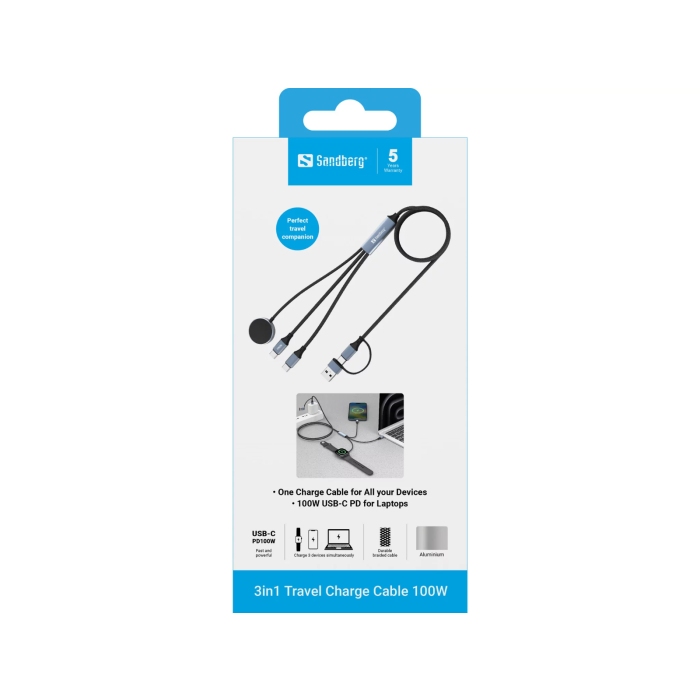 Sandberg 3in1 Travel Charge Cable 100W vam omogoča, da hkrati napolnite prenosnik, pametni telefon in Apple Watch—brez potrebe po več kablih. Močan USB-C PD kabel lahko vašemu prenosniku zagotovi do 100W, ko ga uporabljate samostojno. Ko hkrati povežete več naprav, se moč samodejno porazdeli med priključke, kar zagotavlja varno in učinkovito polnjenje vseh naprav. Popoln za potovanja, pisarno ali nočno omarico. Pleten kabel in aluminijasti priključki zagotavljajo maksimalno vzdržljivost in eleganten videz.
