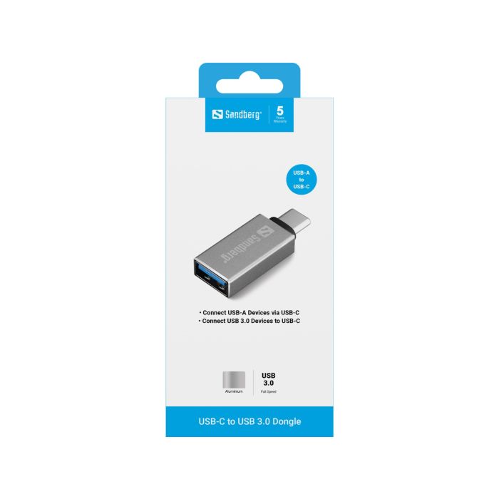 S Sandberg USB-C v USB-A 3.0 Dongle vmesnikom lahko povežete standardno USB-A opremo na vaš računalnik z USB-C priključkom, in to celo z možnostjo izkoriščanja super hitrega USB 3.0 standarda. Samo priključite adapter v vaš USB-C priključek, in lahko povežete USB-A opremo, kot so zunanji trdi disk, tiskalnik ali miška.