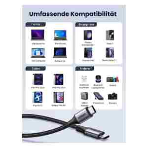 za polnjenje zadostuje 140 W polnilni kabel. Primeren je za hitro polnjenje naprav USB-C od prenosnih računalnikov z visoko zmogljivostjo, tabličnih računalnikov do majhnih naprav, kot so pametni telefoni in slušalke Bluetooth. Združljiv je z MacBook Pro 2023 2022 2021, MacBook Air 2022 2021, MateBook, Spectre X360, XPS 13, Gaming Laptop, iPad Pro 12.9 2021, iPad Air 6, iPad Mini 6, Galaxy S23 Ultra S23+ S2 S21 S20 itd.