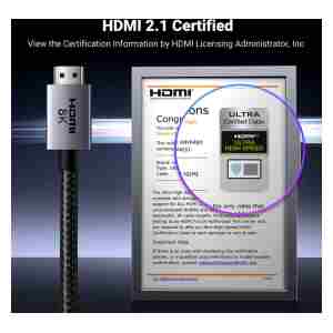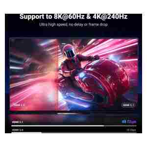 Kabel HDMI 2.1 s pasovno širino 48 Gb/s zagotavlja nestisnjen 8K (7680 x 4320) video in hiter prenos brez izgube signala. Naj bo 2,6-krat hitrejši od HDMI 2.0 (18 Gbps). Kabel HDMI 4K@240Hz podpira tudi spremenljivo hitrost osveževanja in QFT za zmanjšanje “zakasnitve zaslona”. Samodejni način nizke zakasnitve in hitro preklapljanje medijev za filme in video uporabljata mehanizem HDMI VRR za odpravo obdobja zatemnitve, ko naprava HDMI Source preklopi svoj video način