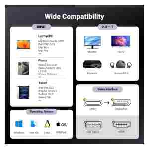 Kabel UGREEN USB C v Displayport 1.4 povezuje telefon ali računalnik z vrati USB Type-C ali Thunderbolt 4/3 na monitor z DisplayPort in ni potrebe po gonilniku ali programski opremi . Ta kabel Display Port na USB C podpira ločljivost do 8K@60Hz (nazaj podpira 4K@240Hz, 2K@240Hz), kar vam ponuja realistično 3D izkušnjo. Z Dynamic HDR lahko uživate v bolj realističnih fotografijah in videoposnetkih s svetlejšimi barvami in večjim kontrastom