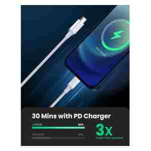 Kabel USB C do Lightning zagotavlja tok največ 3 A, ki napolni iPhone 14 do 60 % v 30 minutah s polnilnikom PD, kar je skoraj 3-krat hitreje kot običajni kabel.