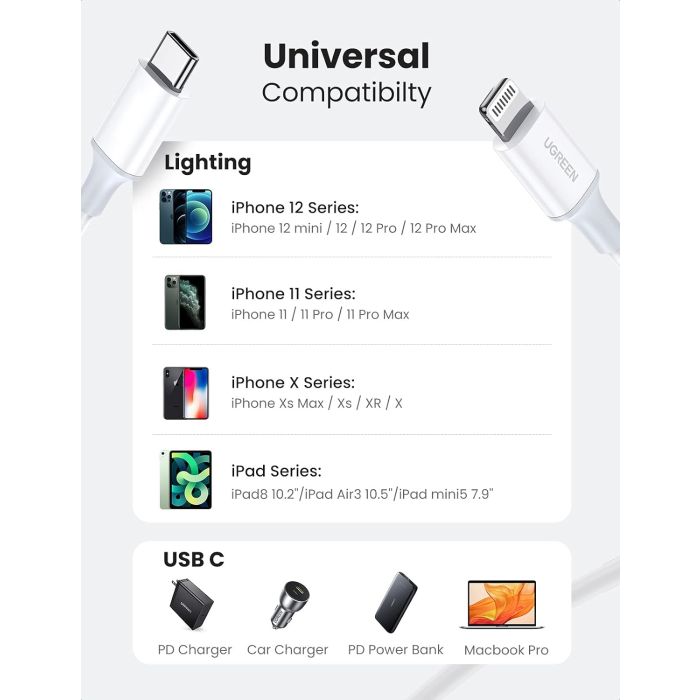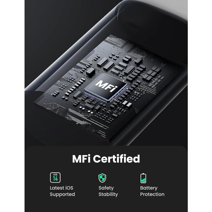 UGREEN Lightning Cable uporablja čip s certifikatom MFi in priključek C94 Lightning za zagotavljanje varnega in hitrega polnjenja za naprave, ki podpirajo PD, in je popolnoma združljiv s sistemi iOS brez skrbi zaradi pojavnih sporočil o napakah.