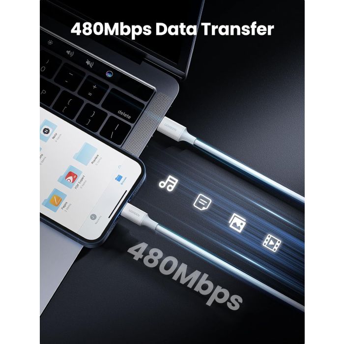 Kabel UGREEN Lightning podpira tudi hitrosti prenosa podatkov do 480 Mbps med iPhoneom in USB-C na prenosnikih/namiznih računalnikih, velike datoteke 1G se prenesejo v 25 s.