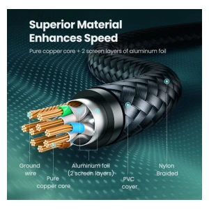 Ethernetni kabel UGREEN je izdelan iz čiste bakrene žice 30 AWG, nižje impedance in manjše izgube z visoko zmogljivostjo. 8 kosov pozlačenih kontaktov se tesno prilega ethernetnemu kablu, kar zagotavlja hitrejšo in stabilnejšo internetno povezavo. Poleg tega obstajajo protiprašni pokrovčki, ki pomagajo ohranjati konektorje urejene in trpežne.