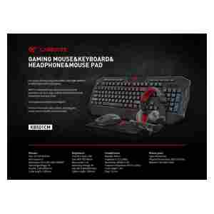 V kompletu boste našli USB tipkovnico z LED osvetlitvijo od zadaj, miško s 6 gumbi in LED osvetlitvijo, gaming podlogo za miško ter stereo slušalke.