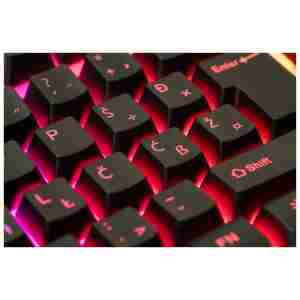 Tipkovnica: 104-tipkovna membranska tipkovnica z dvojnimi tipkami (double-shot keycaps) in 3-barvno osvetlitvijo (mavrični učinek). Zasnovana je za dolgo življenjsko dobo s 10 milijoni pritiskov in podpira 19-keys rollover. Šumniki so označeni.