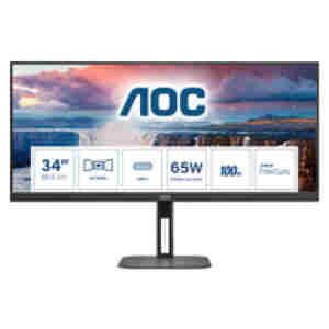 AOC V5 U34V5C/BK. Diagonala zaslona: 86,4 cm (34 palcev), ločljivost zaslona: 3440 x 1440 slikovnih pik, tip HD: UltraWide Quad HD, tehnologija zaslona: LCD, odzivni čas: 4 ms, izvorno razmerje stranic: 21:9, vodoravni kot slike: 178° , Vidni kot, navpično: 178°. Vgrajeni zvočniki. Vgrajeno zvezdišče USB, različica zvezdišča USB: 3.2. generacija 1 (3.1 Gen 1). Nosilec VESA, nastavitev višine. Barva izdelka: Črna.