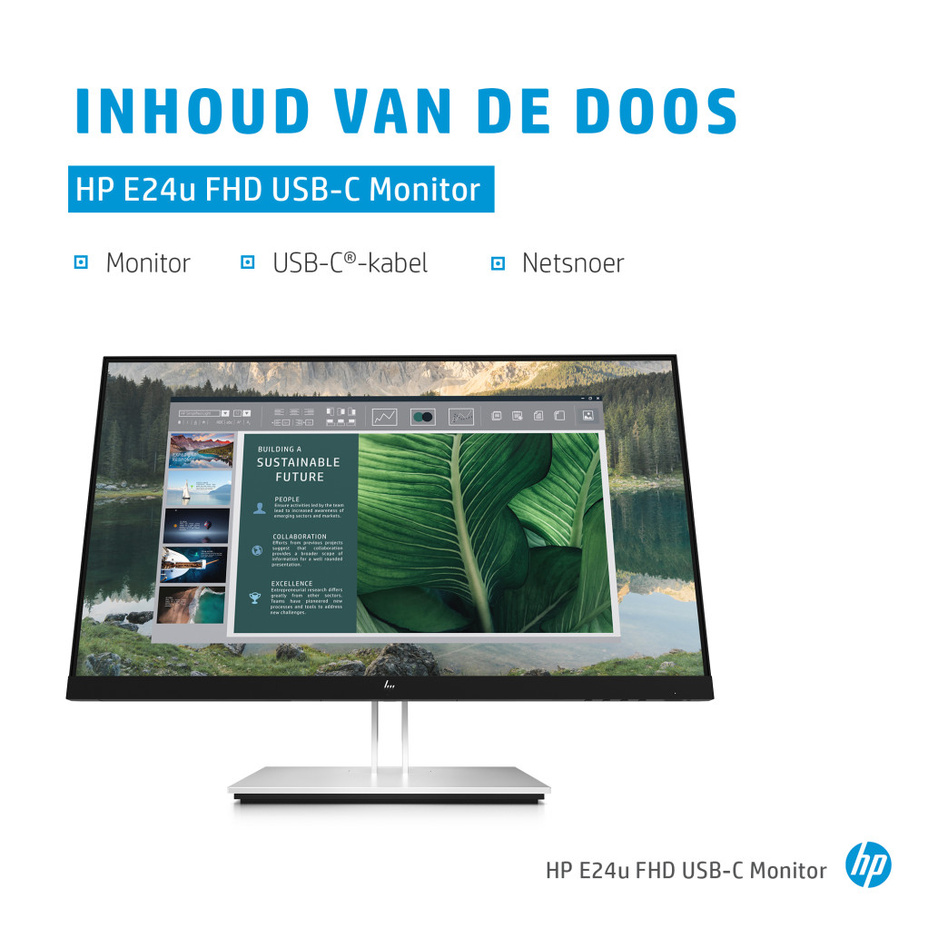 HP E24u G4. Diagonala zaslona: 60,5 cm (23,8 palca), ločljivost zaslona: 1920 x 1080 slikovnih pik, vrsta HD: Full HD, tehnologija zaslona: LCD, odzivni čas: 5 ms, izvorno razmerje stranic: 16: 9, vidni kot, vodoravno: 178 ° , vidnim kotom, vertikalni: 178 °. Integrirano zvezdišče USB. VESA nosilec, nastavitev višine. Barva izdelka: črna, srebrna