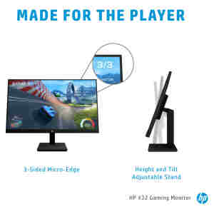 Igralni monitor HP X32 QHD. Diagonala zaslona: 80 cm (31,5 palca), ločljivost zaslona: 2560 x 1440 slikovnih pik, vrsta HD: Quad HD, odzivni čas: 1 ms, izvorno razmerje stranic: 16:9, vodoravni kot gledanja: 178°, navpični vidni kot: 178 °. VESA nosilec, nastavitev višine. Barva izdelka: Črna