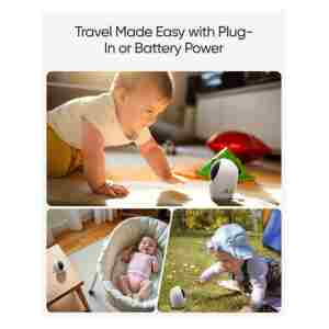S 330° vrtenjem, 60° nagibom in 8× zoomom boste ujeli vsak kot in izraz na obrazu – tudi premikanje prsnega koša v temi, zahvaljujoč izjemno jasnemu nočnemu vidu. Če imate dvojčka, lahko spremljate oba na razdeljenem zaslonu. - Potovanja brez skrbi – z napajanjem prek baterije ali priklopa: