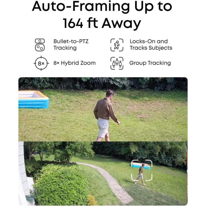 Zavarujte svojo lastnino z dvema 4K fiksnima kamerama za nadzor območij in dvema PTZ kamerama za 4K širokokotni pregled, skupaj s 2K PTZ kamero s 360° vrtenjem in 8× povečavo za aktivno sledenje. AI-ISP zagotavlja živahen barvni nočni vid brez potrebe po reflektorjih. - Samodejno kadriranje in sledenje skupinam