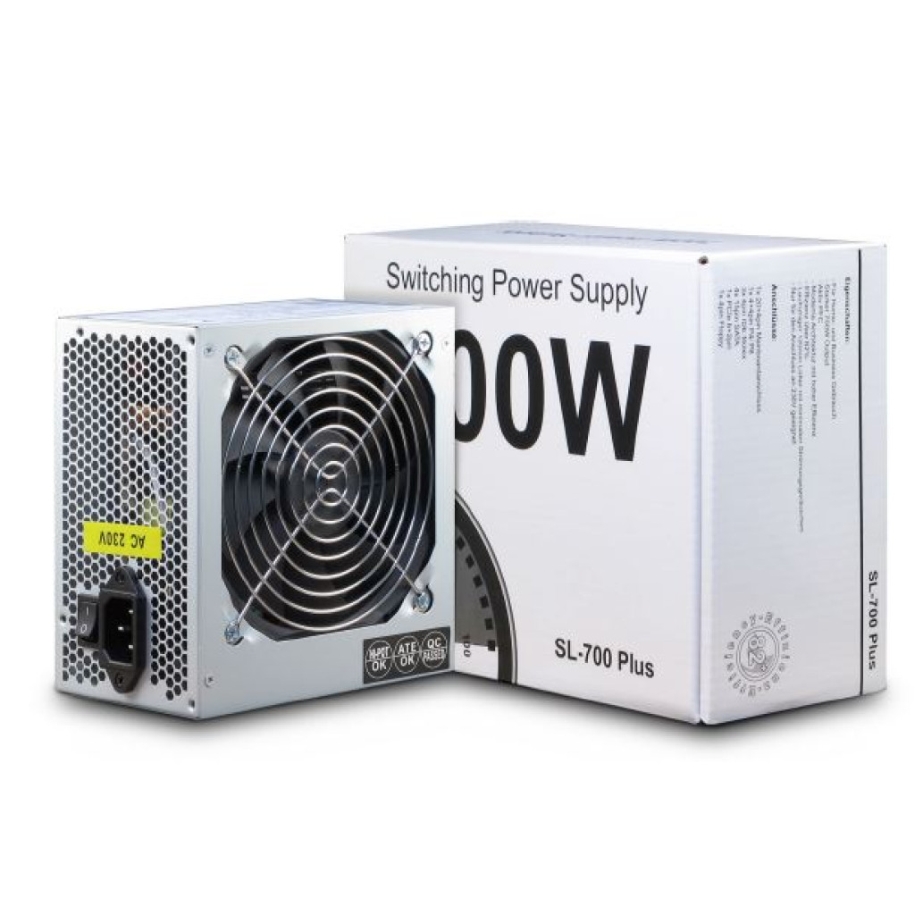 Inter-Tech SL-700 Plus. Skupna moč: 700 W, AC vhodna napetost: 230 V, AC vhodna frekvenca: 50 – 60 Hz Priključek za matično ploščo: 20 + 4 pin ATX. Namen: osebni računalnik, napajalna enota (PSU) Faktor oblike: ATX, raven hrupa: 25 dB. Barva izdelka: srebrna, hlajenje: aktivno, premer ventilatorja: 12 cm. Širina: 150 mm, globina: 140 mm, višina: 86 mm