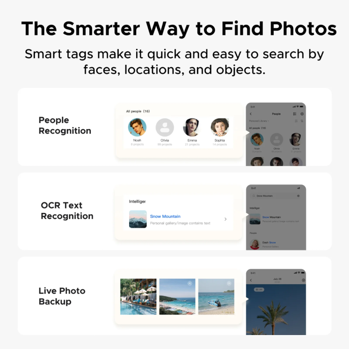 Fotografije razvršča po obrazih, prizorih in lokacijah, odstranjuje podvojene posnetke ter ustvarja personalizirane albume rasti otrok. Omogoča enostavno deljenje z družino prek QR kode ali povezave.