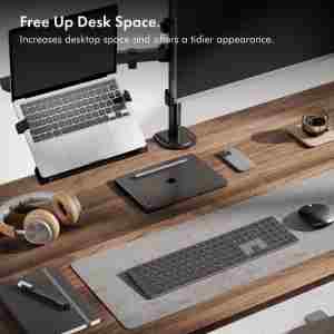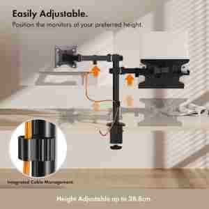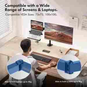 Popolna rešitev za bolj organizirano in ergonomično delovno okolje. Ta nosilec omogoča hkratno uporabo monitorja, prenosnika ali tablice, s čimer prihranite prostor in izboljšate postavitev na delovni mizi.