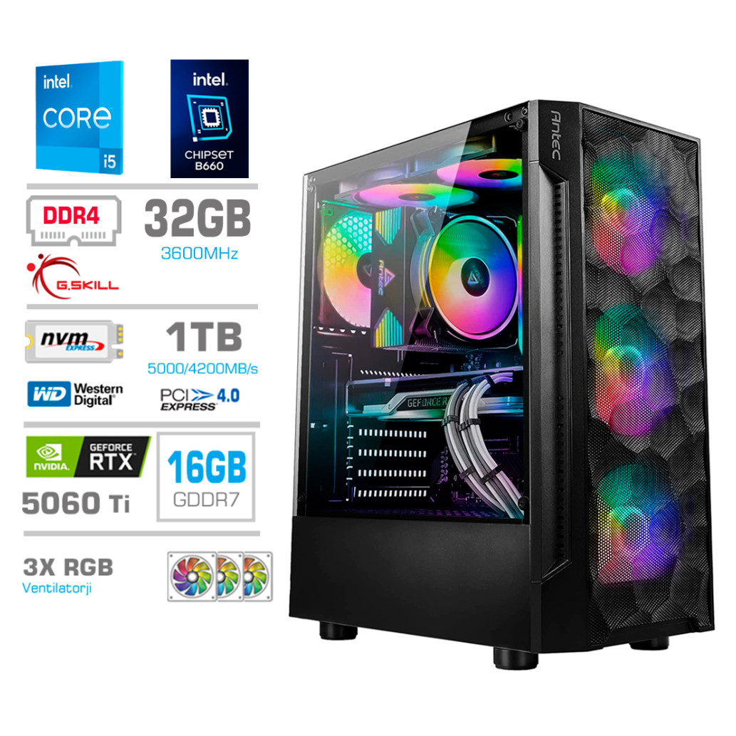 Računalnik MEGA TWR S7 i5-14600KF/RTX5060Ti-16GB/32GB/1TB-4.0/750W/Brez OS RGB