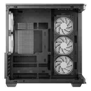 CG590U 5F ima dve zadnji reži za ventilatorje za učinkovitejše odvajanje toplega zraka. Predhodno so nameščeni trije ventilatorji 120 mm ARGB z obrnjenimi lopaticami na strani in dve standardni enoti zadaj, kar ustvarja močan horizontalni pretok.