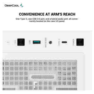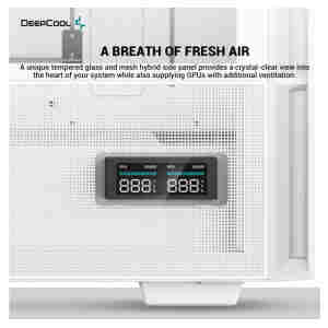 DeepCool CH560 DIGITAL WH. Faktor oblike: Midi Tower, Tip: PC, Barva izdelka: Bela. Postavitev napajalnika: Tla, Podprti faktorji oblike napajalnika: ATX, PS2. Nameščeni ventilatorji (spredaj): 3x 140 mm, Premer podprtih sprednjih ventilatorjev: 120.140 mm, Nameščeni ventilatorji zadaj: 1x 120 mm. Podprte velikosti trdih diskov: 2.5,3.5″. Širina: 230 mm, Globina: 458 mm, Višina: 471 mm.
