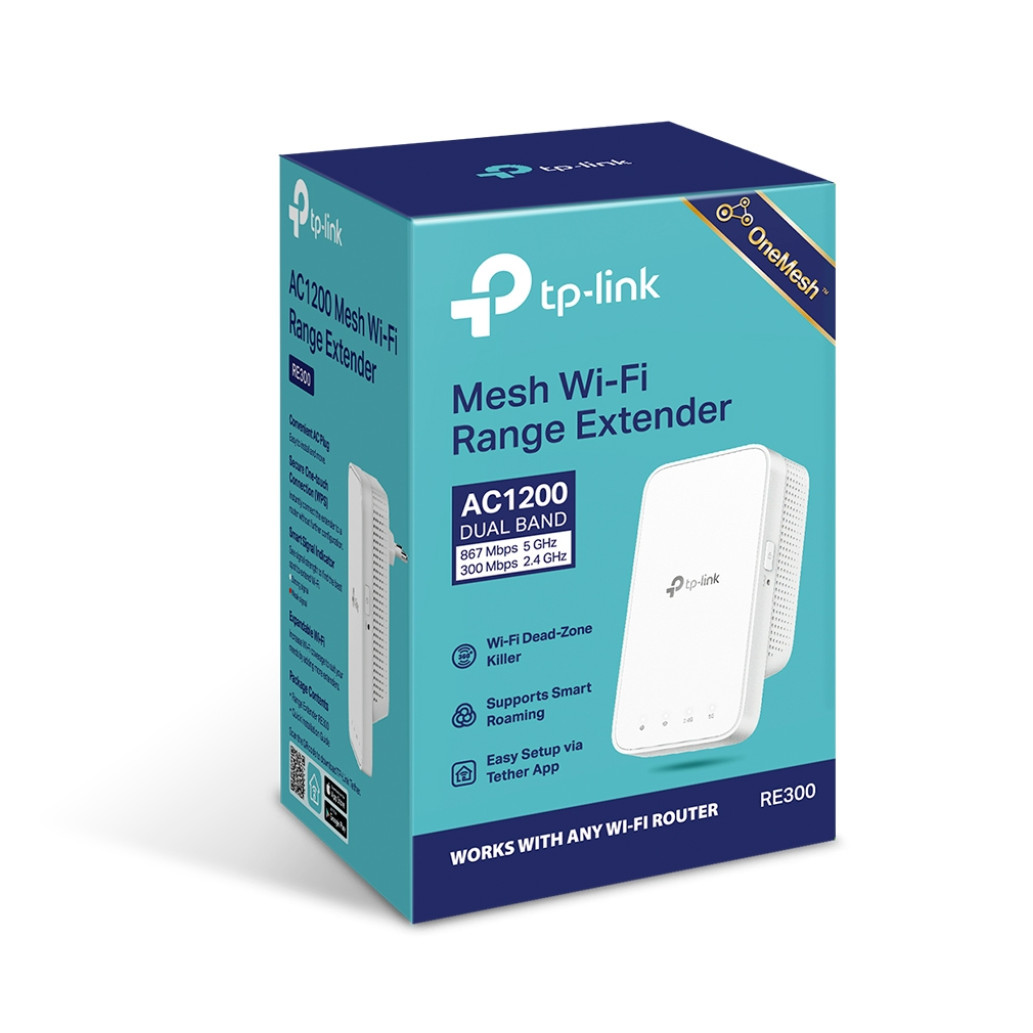 TP-LINK RE300. Tip: Omrežni repetitor, Hitrost prenosa podatkov: 867 Mbit/s. Vrsta antene: Notranja. WLAN standardi: 802.11, 802.11, 802.11g, brezžični 4 (802.11n), brezžični 5 (802.11ac), WLAN glasbenega: Dvojni trak (2,4 GHz / 5 GHz), podprte varnostne algoritme: 64-bitni WEP, 128-bitni WEP, WPA-PSK, WPA2-PSK. Barva izdelka: Bela, Certificiranje: CE, FCC, RoHS. Poraba energije (max): 7,3 W