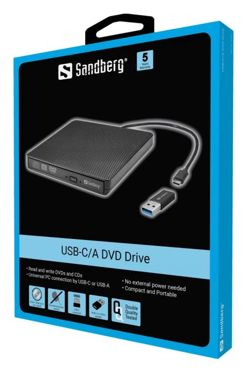 Sandberg USB-C/A DVD Drive zunanji DVD-pogon omogoča enostavno predvajanje in zapisovanje CD-jev ter DVD-jev. Priloženi adapter USB-A na USB-C vam omogoča prilagodljivost za povezovanje enote. Enoto poganja neposredno vaš računalnik, zato zunanji vir napajanja ni potreben.