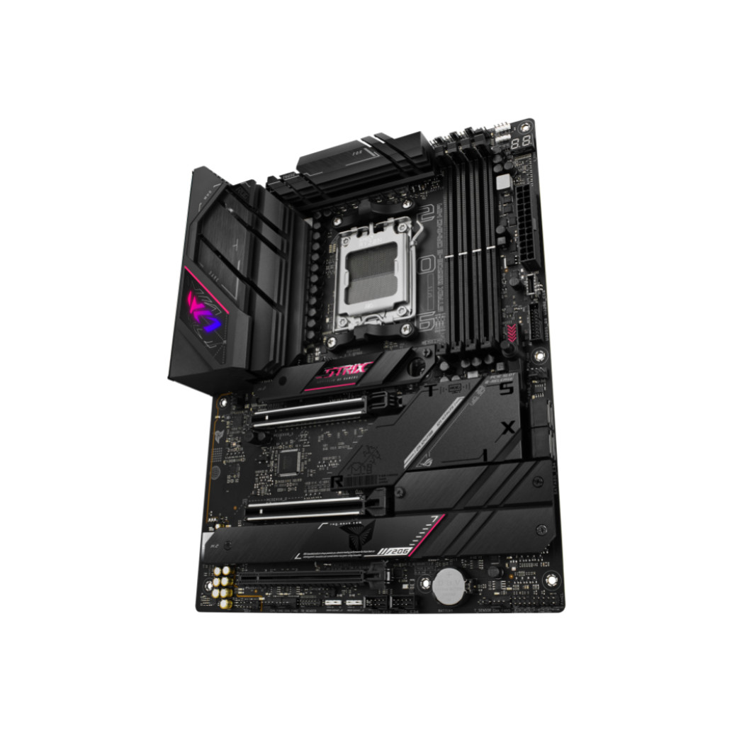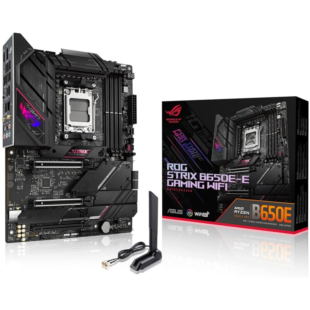 ASUS ROG STRIX B650E-E GAMING WIFI. Proizvajalec procesorja: AMD, vtičnica procesorja: vtičnica AM5, združljivi procesorji: AMD Ryzen 3, AMD Ryzen 7, AMD Ryzen 9 7. generacije. Podprt pomnilnik: DDR5-SDRAM, največ RAM: 128 GB, vrsta pomnilnika: DIMM. Podprti vmesniki pomnilniških pogonov: M.2, SATA III, Podprti pogoni za shranjevanje: HDD & SSD, raven RAID: 0, 1, 10. Vrsta vmesnika Ethernet: 2.5 Gigabit Ethernet, najvišji standard WLAN: Wi-Fi 6E (802.11ax), standardi WLAN: 802.11a, 802.11b, 802.11g, Wi-Fi 4 (802.11n), Wi-Fi 5 (802.11ac), Wi-Fi 6 (802.11ax), Wi-Fi 6E…. Komponenta za: PC, Faktor oblike matične plošče: ATX, Družina čipov matične plošče: AMD.