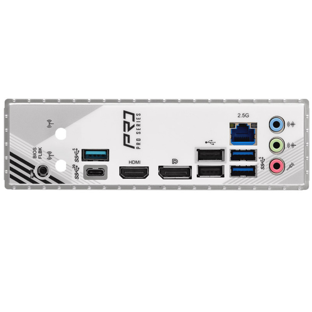 | Zadnja plošča V/I | – 2x Antenna Mounting Points – 1x HDMI Port – 1x DisplayPort 1.4 – 1x USB 3.2 Gen2x2 Type-C Port (20 Gb/s) – 3x USB 3.2 Gen1 Ports – 2x USB 2.0 Ports – 1x RJ-45 LAN Port – HD Audio Jacks: Line in / Front Speaker / Microphone |
