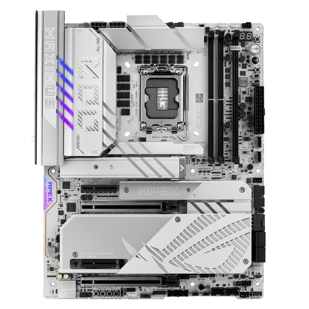 ASUS ROG Maximus Z890 Apex je matična plošča ATX z vrhunskim naborom čipov Intel Z890 in vtičnico LGA 1851 . Podpira procesorje Intel Core Ultra druge generacije s kodnim imenom Arrow Lake. Matična plošča Intel Z890 izvorno podpira USB4, ki ponuja hitrosti prenosa podatkov do 40 Gbit/s. Poleg tega ASUS ROG Maximus Z890 Apex navdušuje s popolno povezljivostjo PCIe 5.0, ki vam zagotavlja dvojno pasovno širino za grafične kartice in diske NVMe SSD v primerjavi s PCIe 4.0.